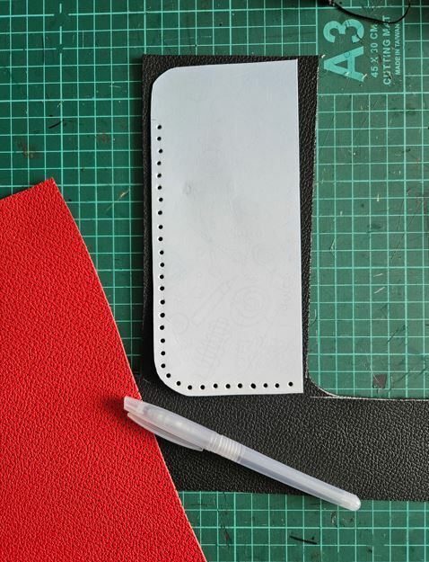 Используя шаблон, кроим две детали. Одна деталь из перфорированной экокожи, верх чехла. Эту деталь декорируем